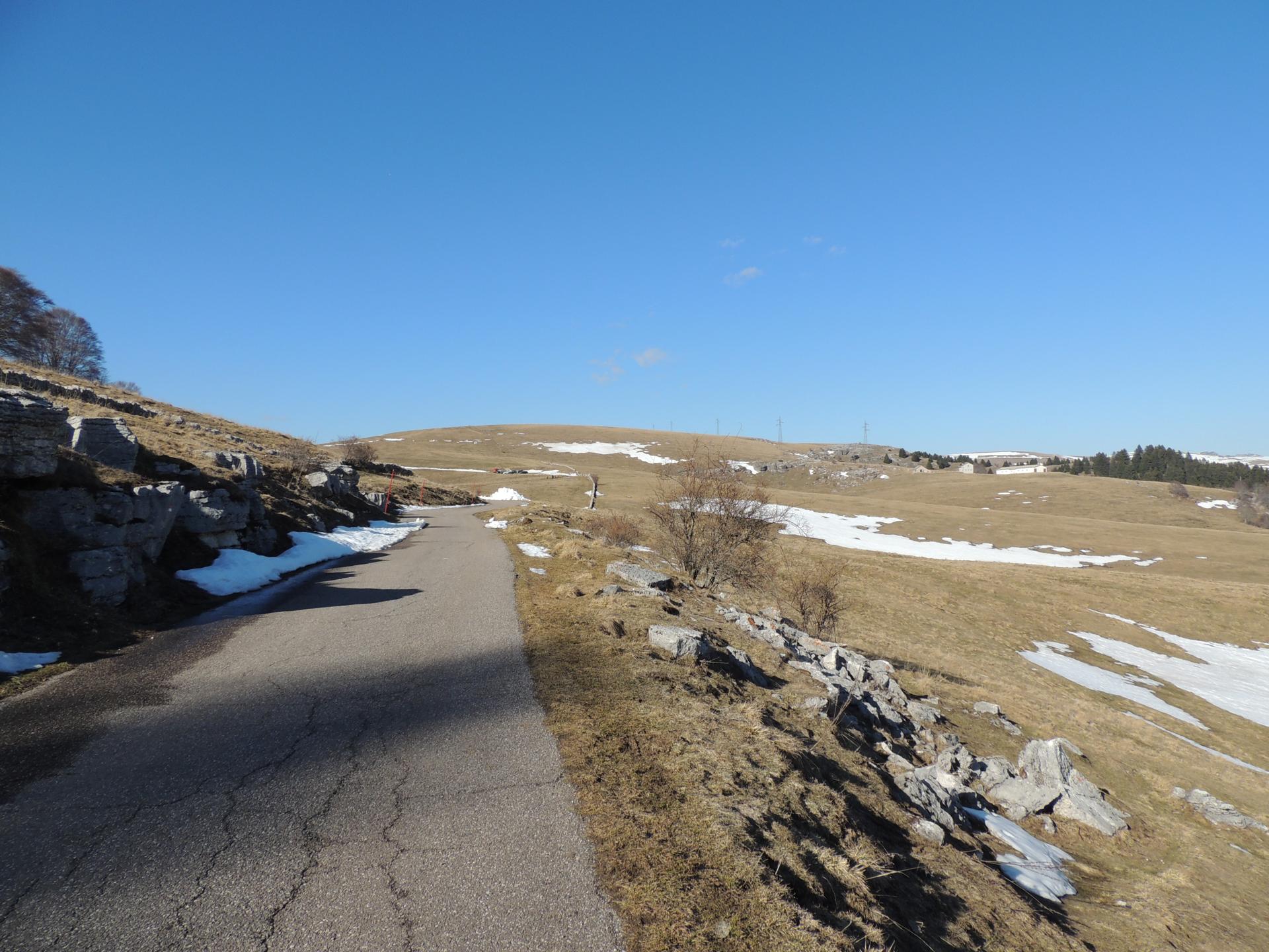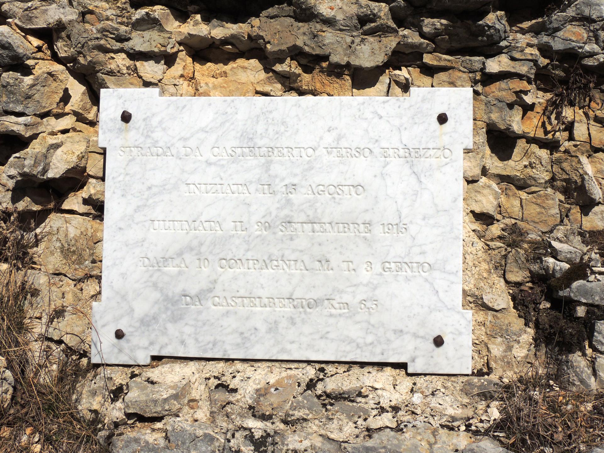Scendendo dalla sella ci ricongiungiamo alla strada e attraversiamo Bocchetta della Vallina, scoprendo una targa che indica che stiamo percorrendo proprio una vecchia strada militare che da Erbezzo conduce fino al Rifugio Castelberto, costruita nel 1915 ad opera della 10a Compagnia del 3° Genio.