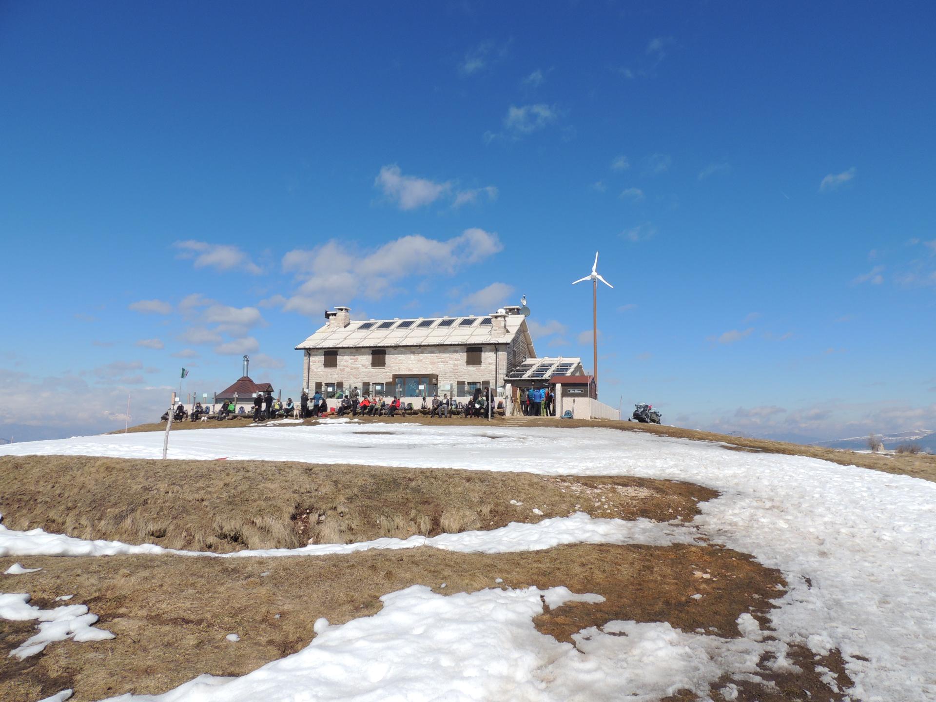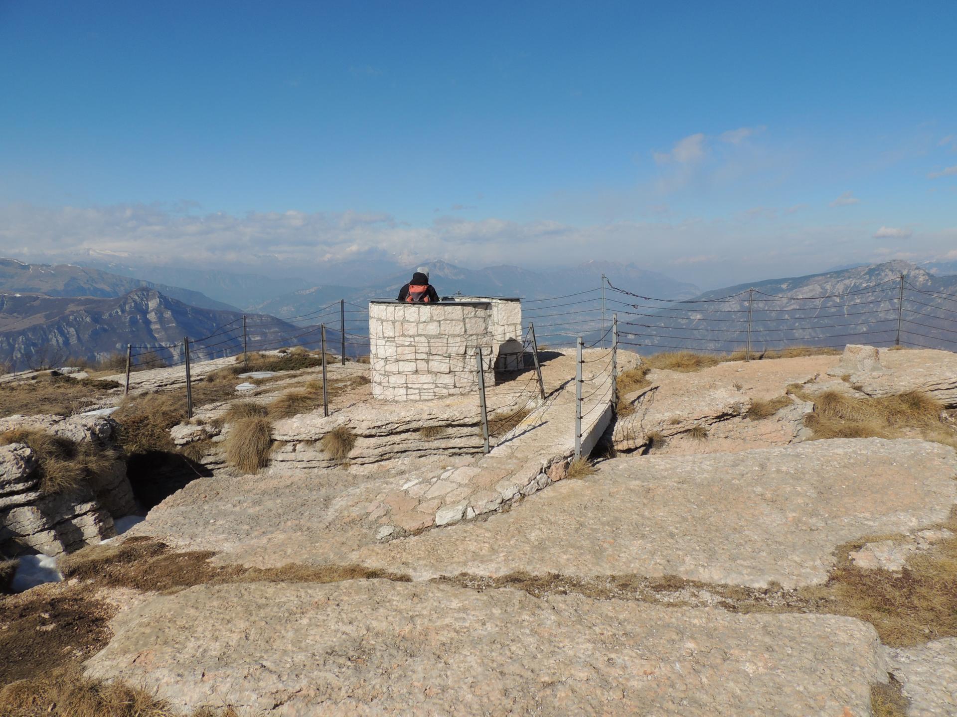 Proseguendo poco oltre il rifugio si giunge al limite della scarpata, dove troviamo una serie di trincee e cunicoli della I^ Guerra Mondiale. In questo punto strategico era posizionato un'osservatorio che permetteva di spaziare con lo sguardo lungo la Valle dell'Adige fino a Mori, Rovereto e oltre; e di osservare tutti i monti e le cime circostanti, dalla dorsale del Monte Baldo, al Monte Altissimo di Nago, al Monte Stivo, compreso l'Adamello e il Gruppo del Brenta, passando poi per i Gruppi del Pasubio e del Carega.