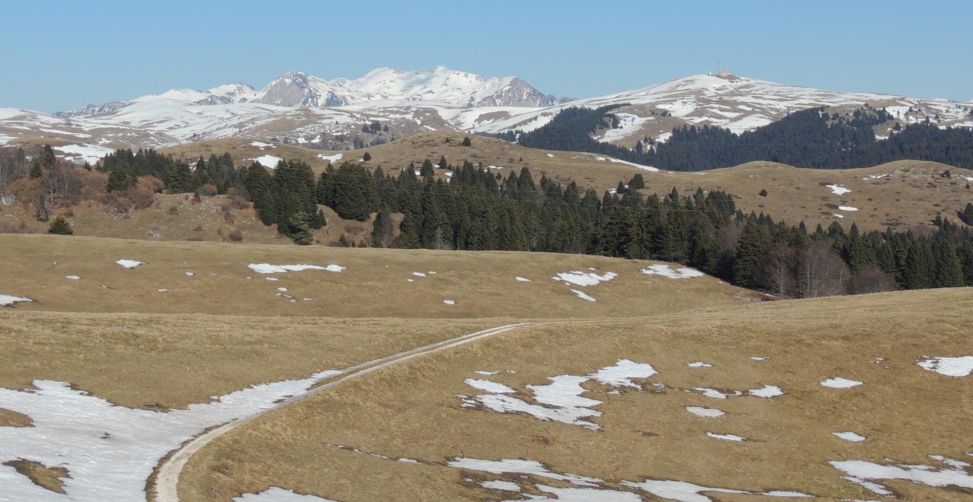 Passata la bocchetta, cambiamo versante e l'orizzonte si apre ora alla nostra destra, possiamo così iniziare ad apprezzare la vista verso il Monte Tomba e il Gruppo del Carega.