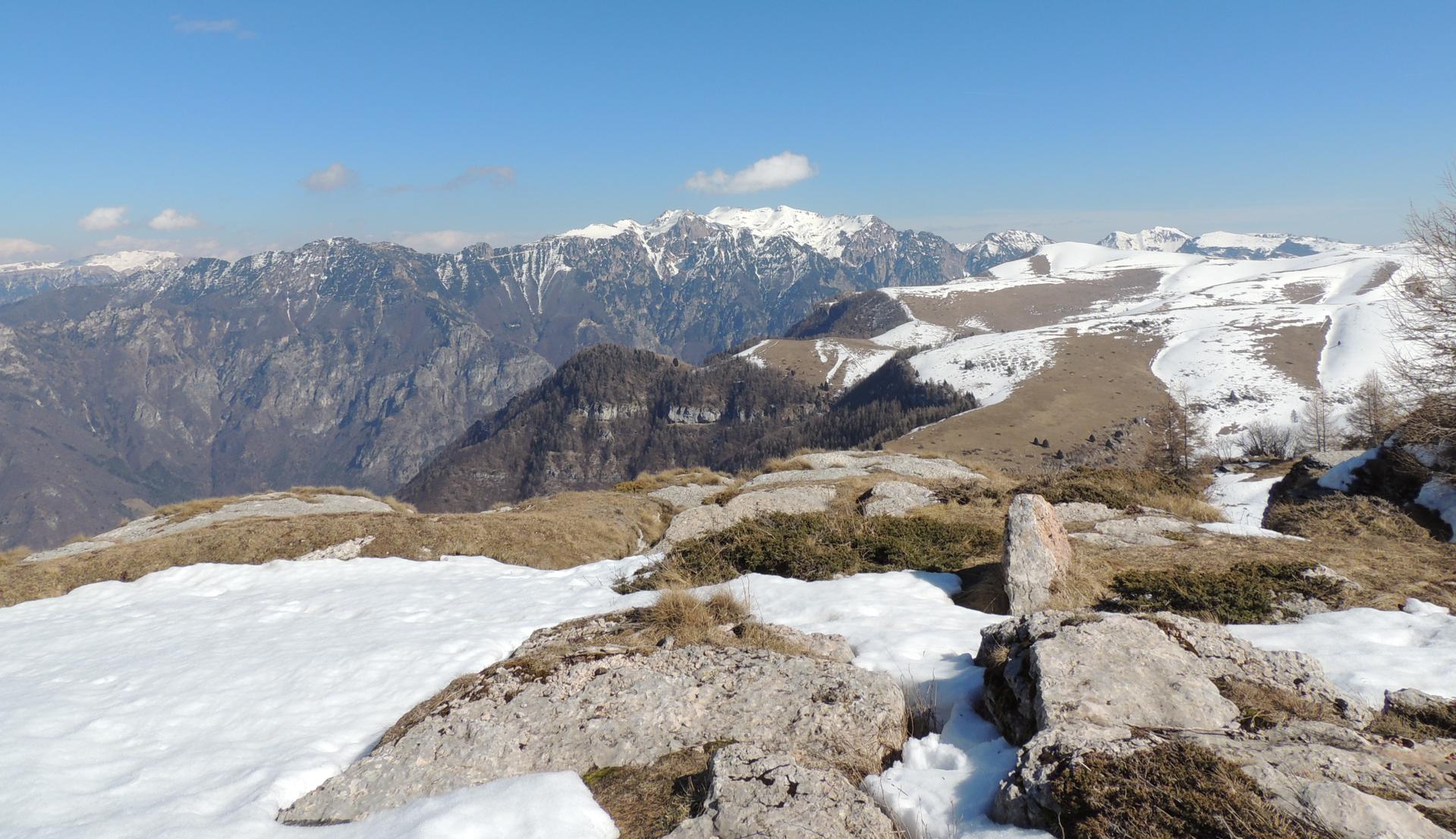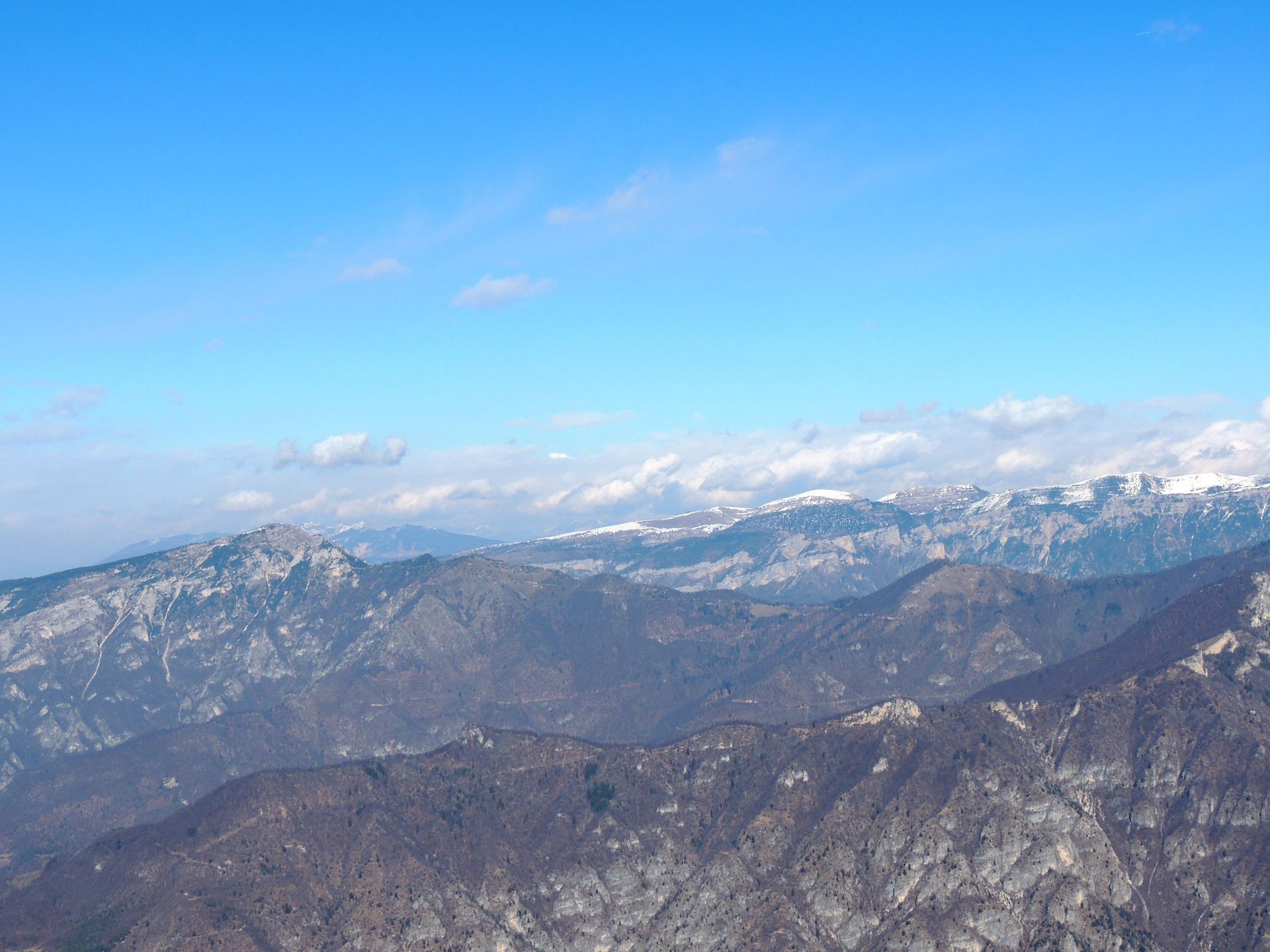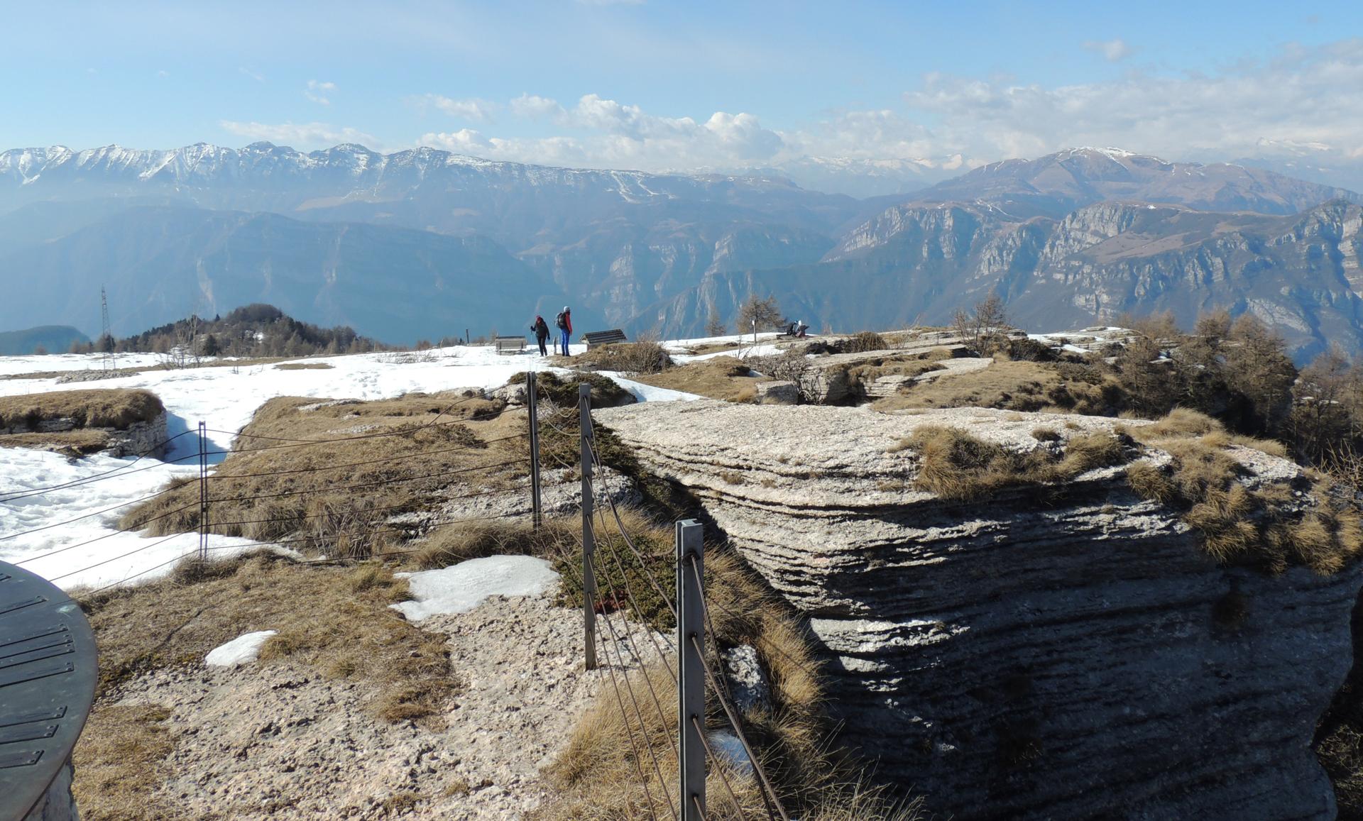 Sullo sfondo da sn, il Corno Mozzo, Monte Cornetto con il ripetitore radio e il Corno d'Aquilio. Oltre la catena del Baldo da Punta di Naole a Cima Costabella.
