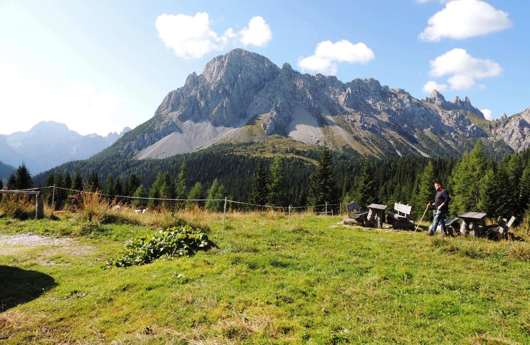 Il rifugio sorge su un'ampia radura ai margini della parete Sud del Monte Peralba