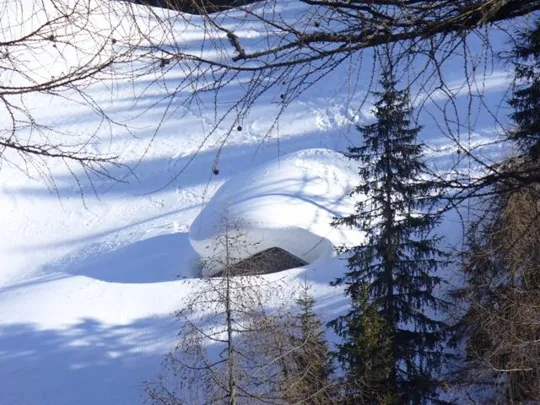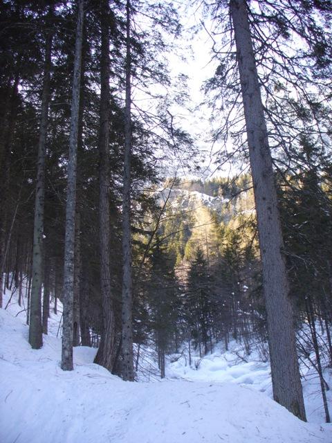 Dopo aver fatto tappa nel caratteristico rifugio, iniziamo il percorso di ritorno scendendo a sud, dapprima verso i prati innevati e successivamente attraverso i boschi