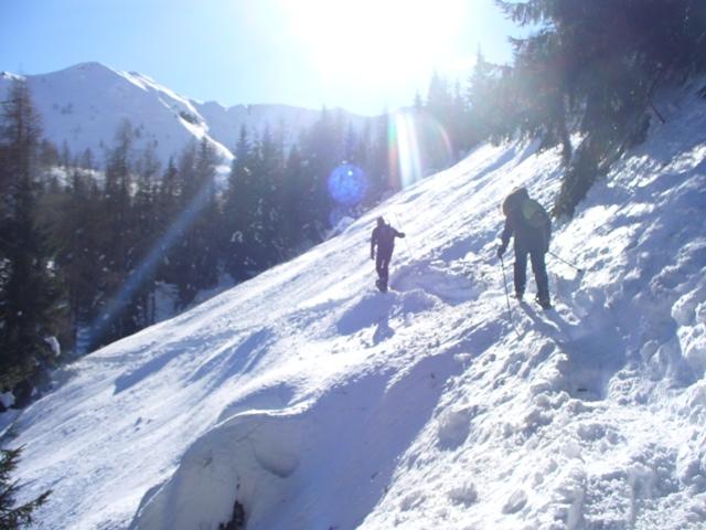 Scendendo su pendii di neve morbida chiudiamo ad anello raccordandoci sul sentiero che ci porta prima a Malga Lòsch 1886 m