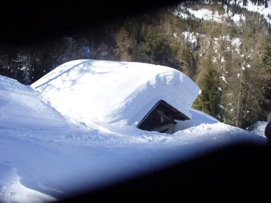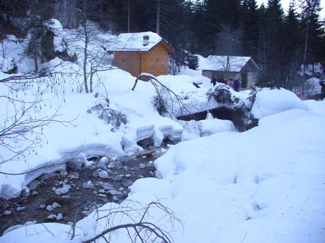 Poco oltre, è proprio il caso di dirlo, spuntano dalla neve alcune case sono i fienili Domadore