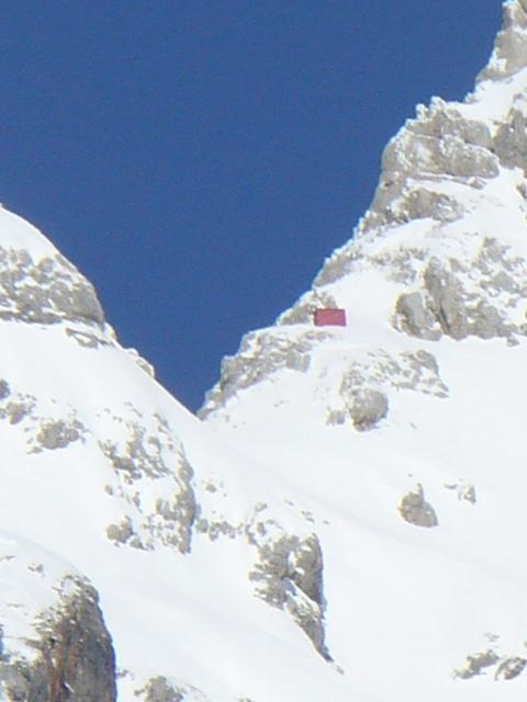 La guglia chiamata "Campanile di San Marco" e il bivacco Giancarlo Biasin (a 2650 mt) nella Forcella dello Spizzon