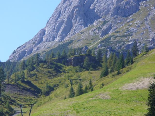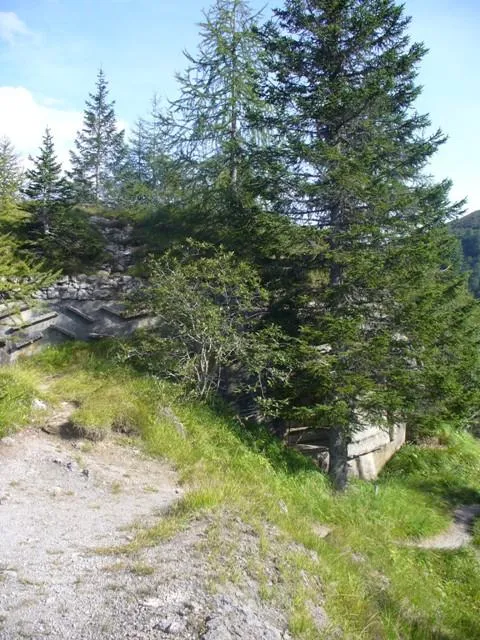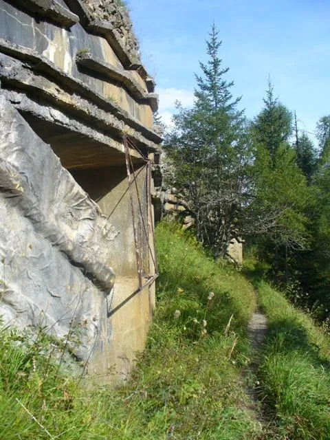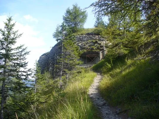 Il sentiero inizia a destra della pista di sci con un carrareccia delimitata da uno steccato ma poco oltre un fienile diventa un sentiero che si inerpica con un paio di svolte sul fianco della montagna per superare con un ripido ma breve pendio il dislivello che porta direttamente sulla pista di sci. Finalmente da questo punto è possibile scorgere nettamente la fortificazione fino ad ora parzialmente nascosta dalla mimetizzazione. Ancora pochi metri ed è possibile scorgerlo chiaramente.