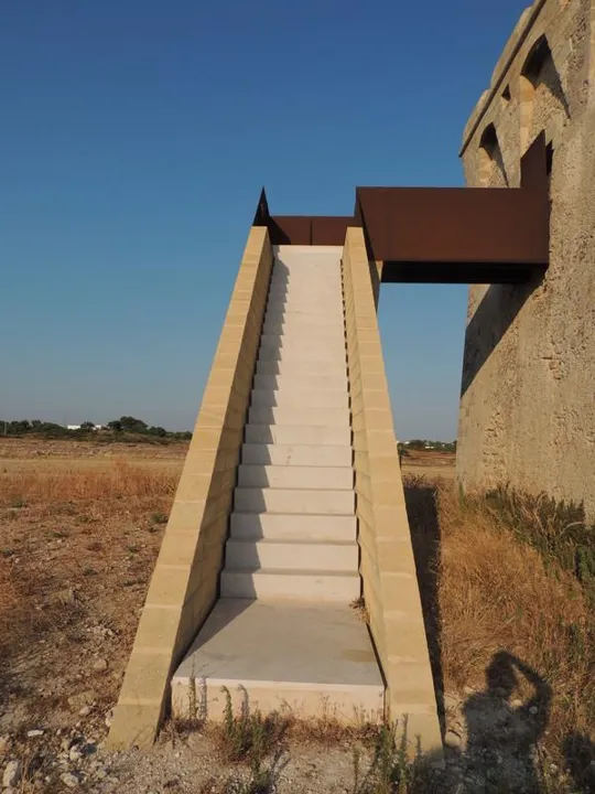 Il recente restauro ha fornito all'opera una scala d'accesso con un'insolita piega di 90, non é chiaro se é stata ricostruita sui resti dell'originale, peraltro mai riscontrata, o si tratti di libera interpretazione, ma se fosse ricostruita come in origine avrebbe sicuramente un effetto difensivo maggiore smorzando l'impeto degli aggressori.
