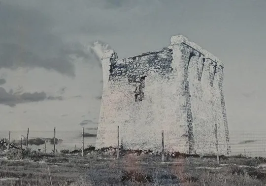 Vicino alla torre vi é una costruzione e più in lontananza una pajara una tipica costruzione rurale eseguita con pietre a secco.