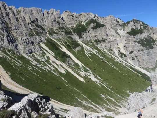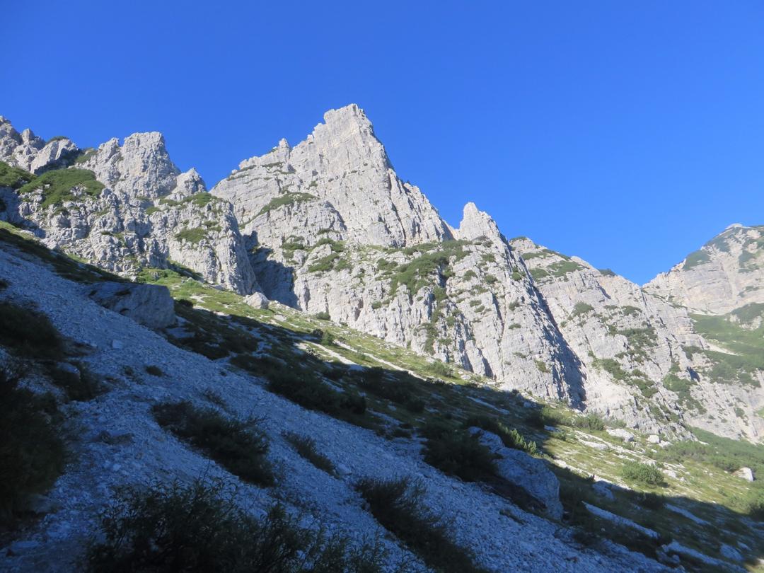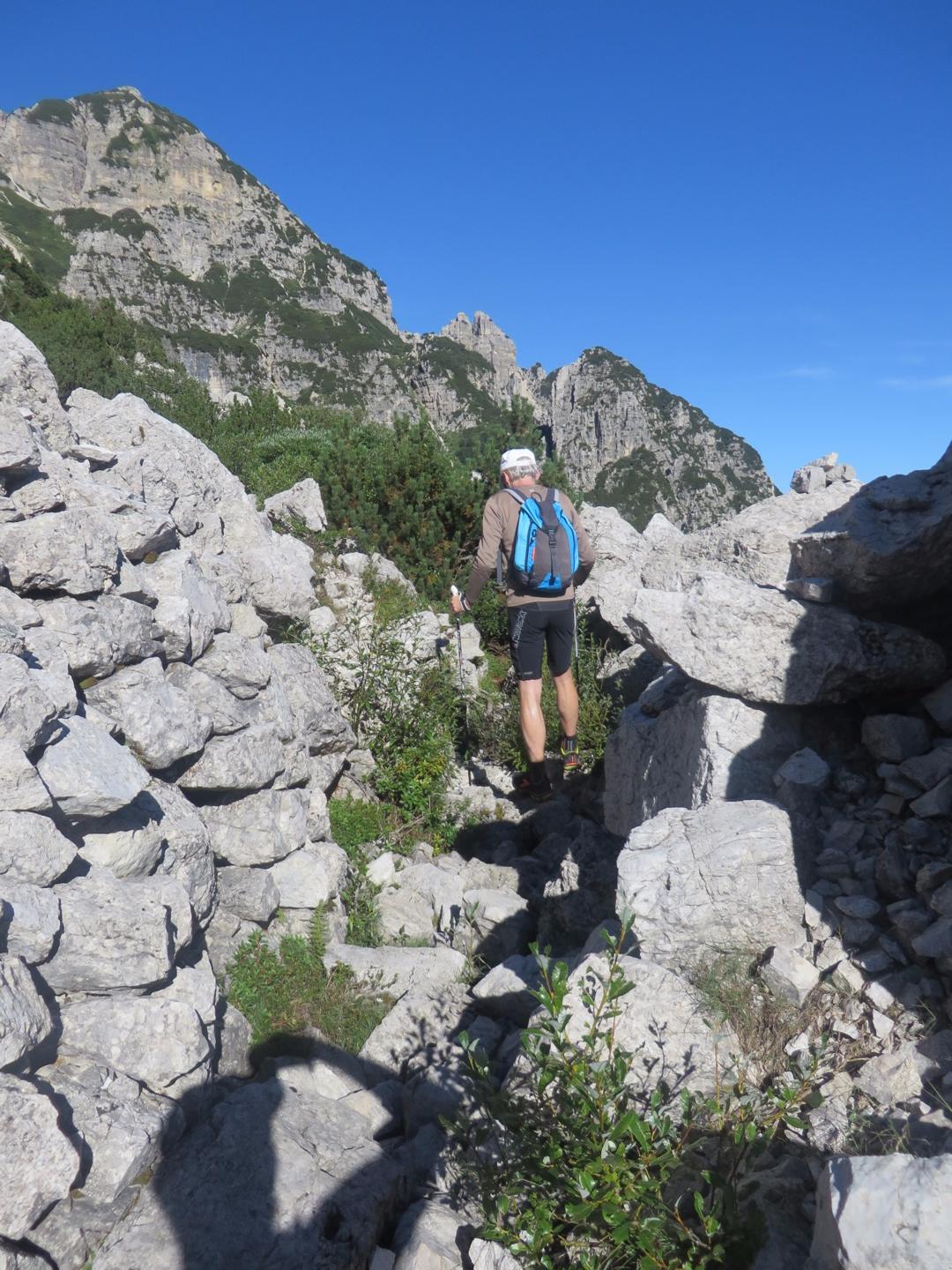 Dopo la fessura inizia il ghiaione, si tratta di una salita abbastanza ripida ma che presenta un bel sentiero a tornantini ben segnato. Si è contornati da belle pareti di roccia.