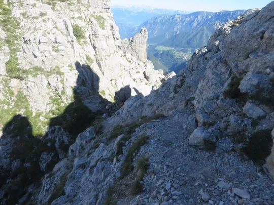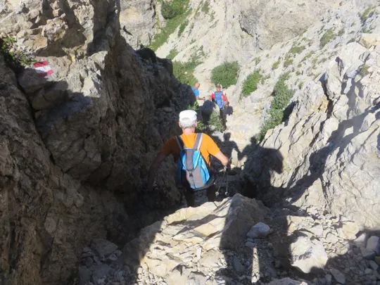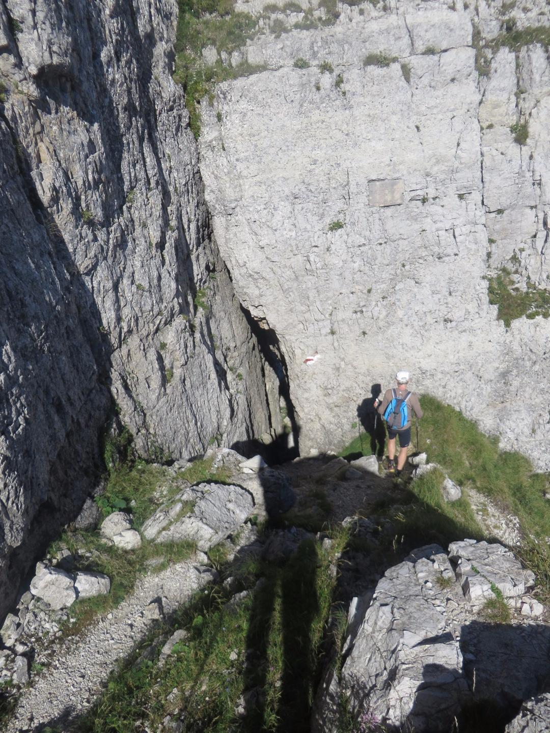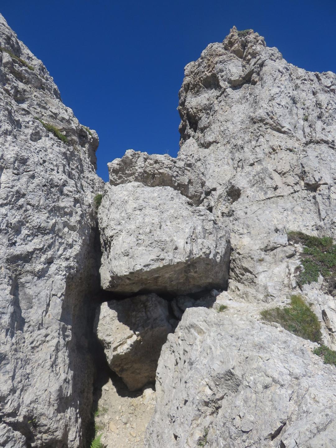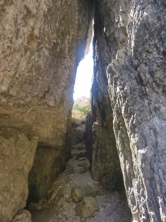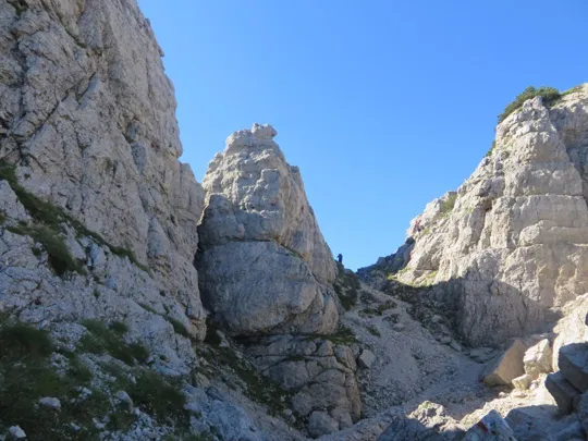Qui inizia il vero sentiero, che all'inizio segue un paio di tratti in trincea, fino a raggiungere una guglia, dove si dovrà passare per una stretta fessura.