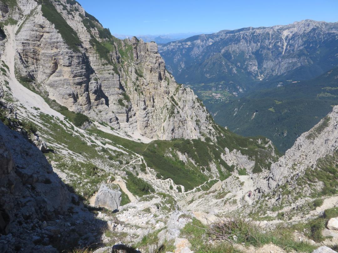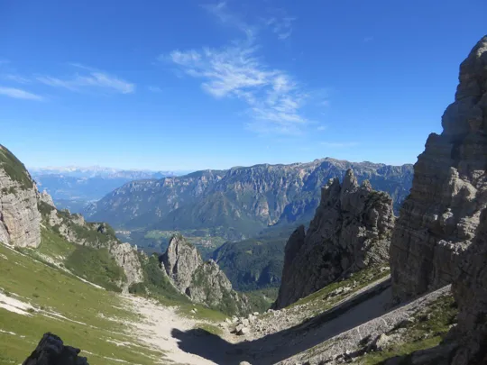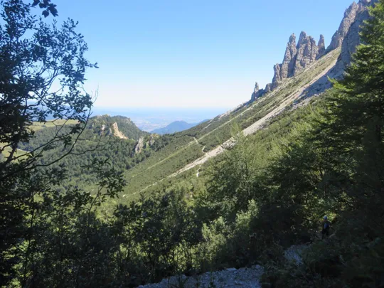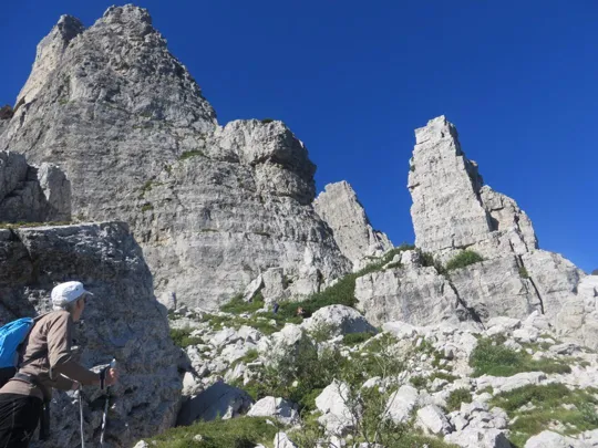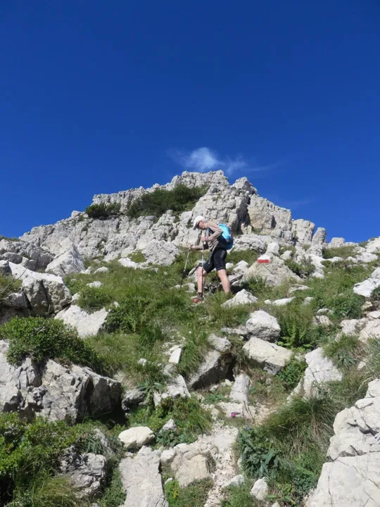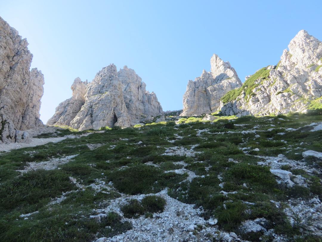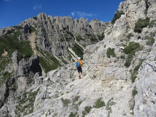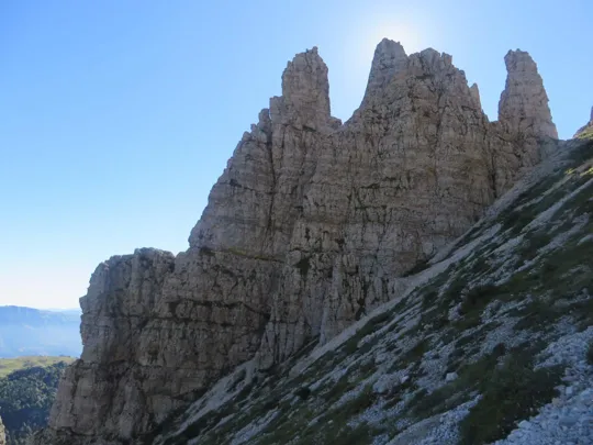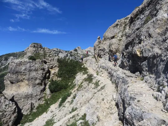 Qui inizia il vero sentiero, che all'inizio segue un paio di tratti in trincea, fino a raggiungere una guglia, dove si dovrà passare per una stretta fessura.