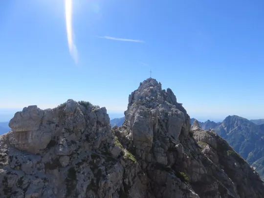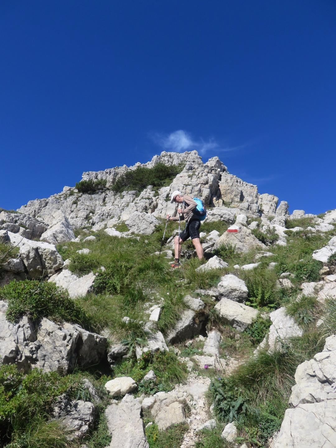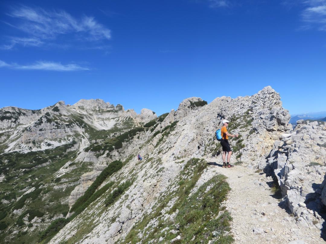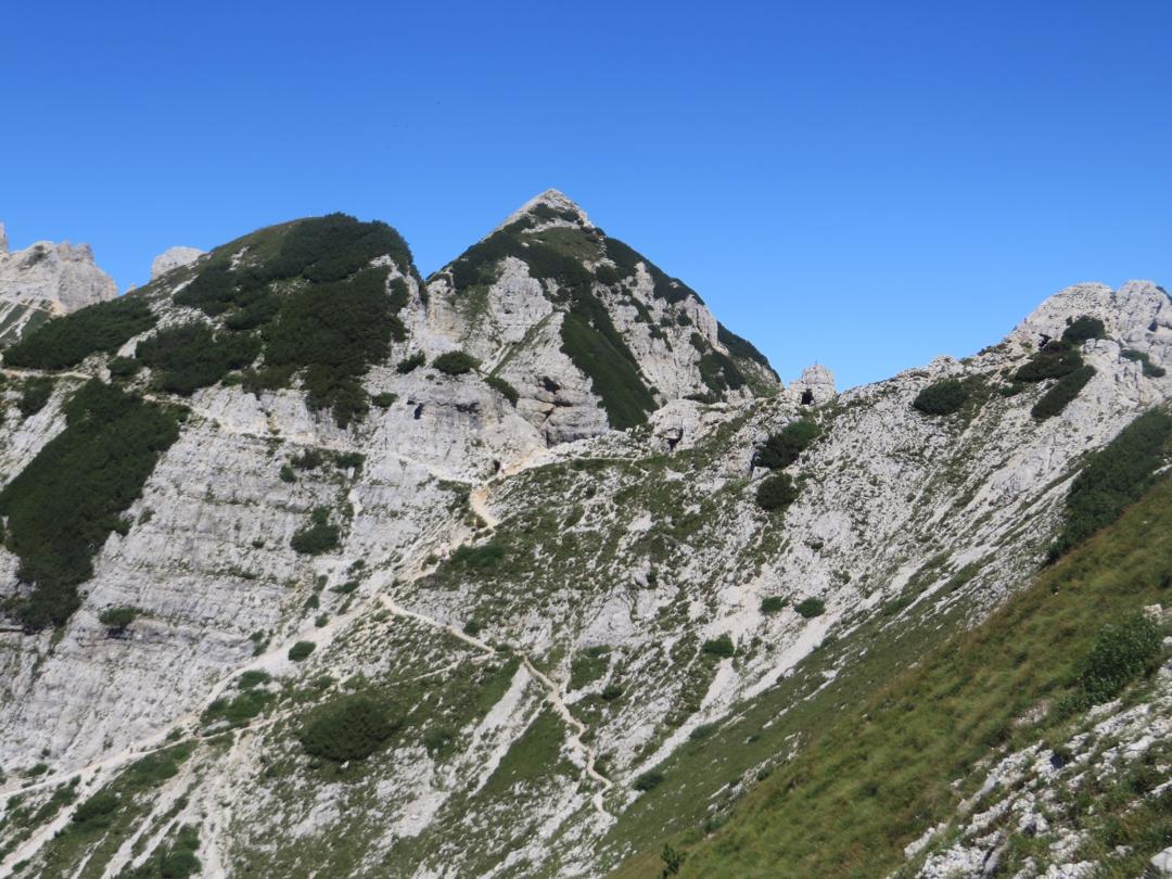 Una volta salito il ghiaione, si arriva ad una forcella. Subito prima c'è un sentiero sulla destra, che è quello che si prenderà per il ritorno. Se invece si vuole salire sulla cima (5 minuti), si supera la forcella e si sta sulla sinistra, dove c'è un sentiero un pò esposto con un passaggio di II° grado. Dalla cima (2072m) la vista è impareggiabile.