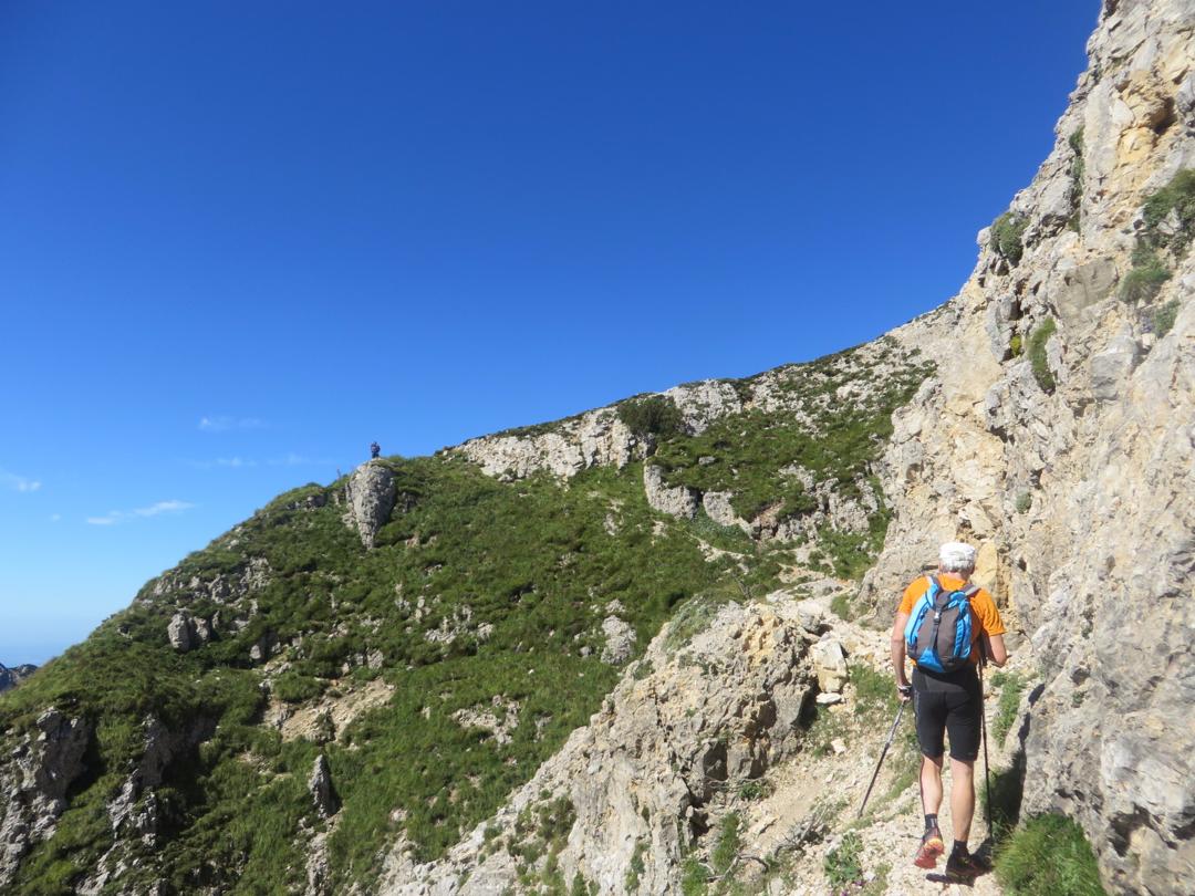 A questo punto si ritorna alla forcella e si hanno due possibilità: o si può tornare per la stessa strada, oppure si prende la deviazione sulla sinistra subito dopo la forcella (scendendo) e si va verso bocchetta fondi. Il sentiero da percorrere, quasi tutto in cresta, è molto suggestivo. Ci sono un paio di saliscendi, è un pò esposto, con un tratto attrezzato con cordino mettallico, ma fattibile prestando attenzione.
