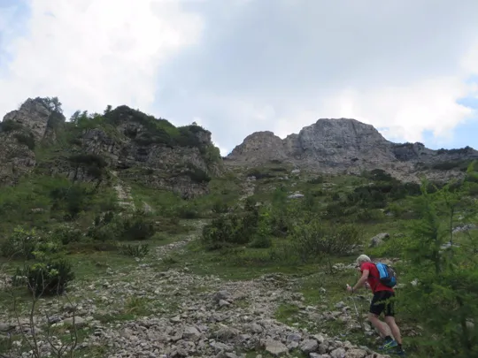 Dopo avere superato un'altra strettoia si vede il Passo degli Alberghetti, la fine della Val del Pruche. Sembra vicino ma c'è un ultimo tratto bello ripido da percorrere.
