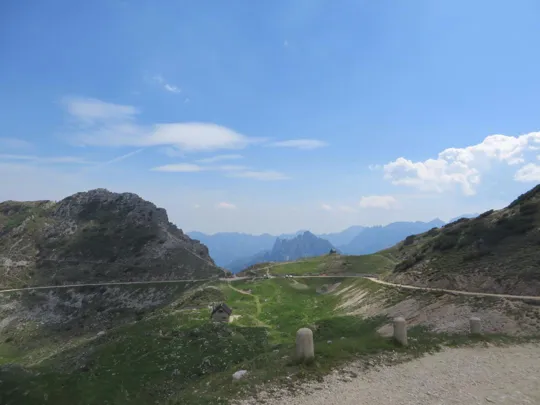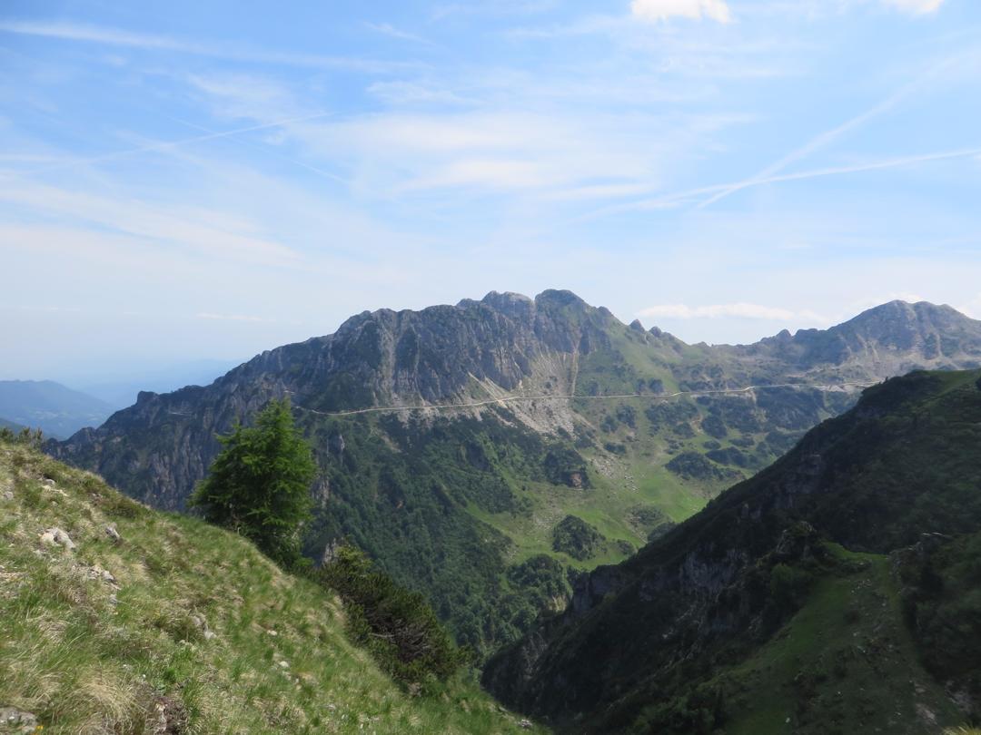 Appena dopo il passo si può vedere l'altro versante del Pasubio e la strada in costa che ci porterà prima all'Arco Romano e poi alle Porte del Pasubio e quindi al Rifugio Papa.