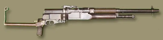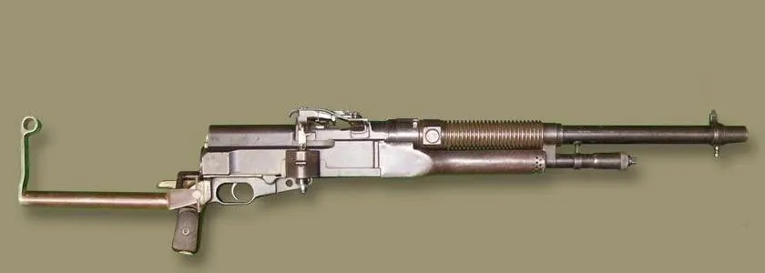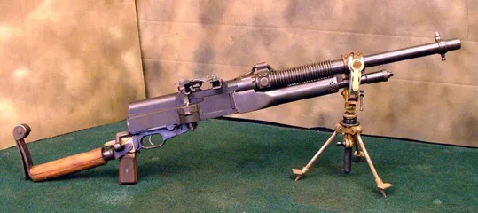 Questa mitragliatrice leggera è la Hotchkiss mod. 1909, conosciuta anche come Benet-Mercie, o Hotchkiss portatile, di costruzione Francese, usata (poco) dall'esercito francese in cal. 8 mm Lebel; adottata dall'esercito britannico come fucile-mitragliatore per la cavalleria e per le truppe coloniali indiane impiegate nelle Fiandre e nelle Somme in cal. 303 britannico. Usata anche dalle truppe americane nel '17-'18 fornita (non solo questo modello) dalla Francia per mancanza di disponibilità di armi americane. Era alimentata da caricatori a lastrina da 30 colpi, era possibile utilizzarla con bipede o con un piccolo treppiede che poteva essere montato in due supporti differenti presenti sulla canna, il calcio era smontabile e sostituibile in due tipi diversi [in legno (di miglior disegno ma molto più costoso) e in metallo (semplice tubo)].
